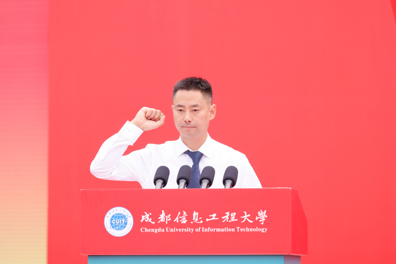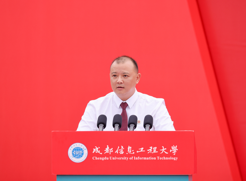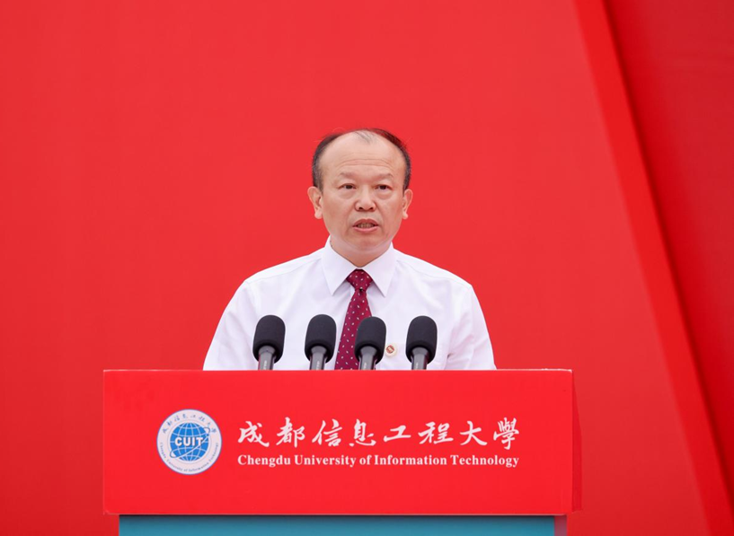 何建新向新同学表示热烈欢迎和诚挚祝贺。他指出,本届典礼因首批博士研究生的加入而具有特殊历史意义,标志着学校向“双一流”建设迈出更坚实的一步。他结合人工智能的时代背景,勉励全体学生以“智启未来,坚守本心”为行动指南,成长为兼具技术素养与人文精神的新时代建设者。学校成立人工智能学院,推动“AI+X”跨学科融合,助力学生掌握AI思维与原创力。同时,我们强调培养同理心、沟通力与批判性思维,坚守人文价值,让技术真正服务于人类福祉,闪耀人性光芒。他寄语新生,珍视多元成长机遇,永葆勤学笃行的奋进姿态;坚守求真立德初心,涵养仁爱诚信高尚品格;筑牢身心根基,厚植担当报国之志。他勉励大家秉承“成于大气,信达天下”的校训,做多元创新的成信人,在中华民族伟大复兴的征程中贡献青春智慧。