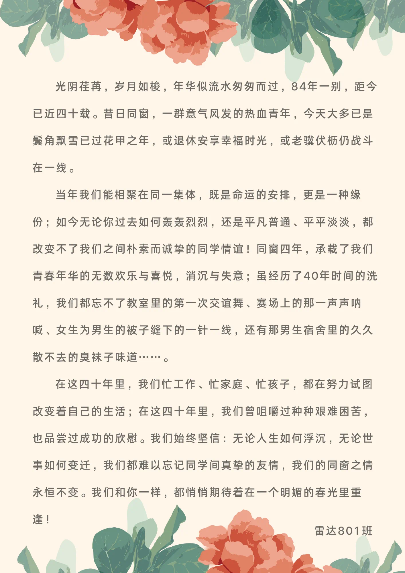 雷达801班班主任吴长明老师讲话。她说,看到各位同学在各自工作岗位辛勤耕耘,施展才华,创造业绩,为母校赢得了良好的社会声誉,自己感到由衷的高兴,并讲述了与校友们共度青葱岁月的校园学习生活故事,追忆师生情、同窗情。