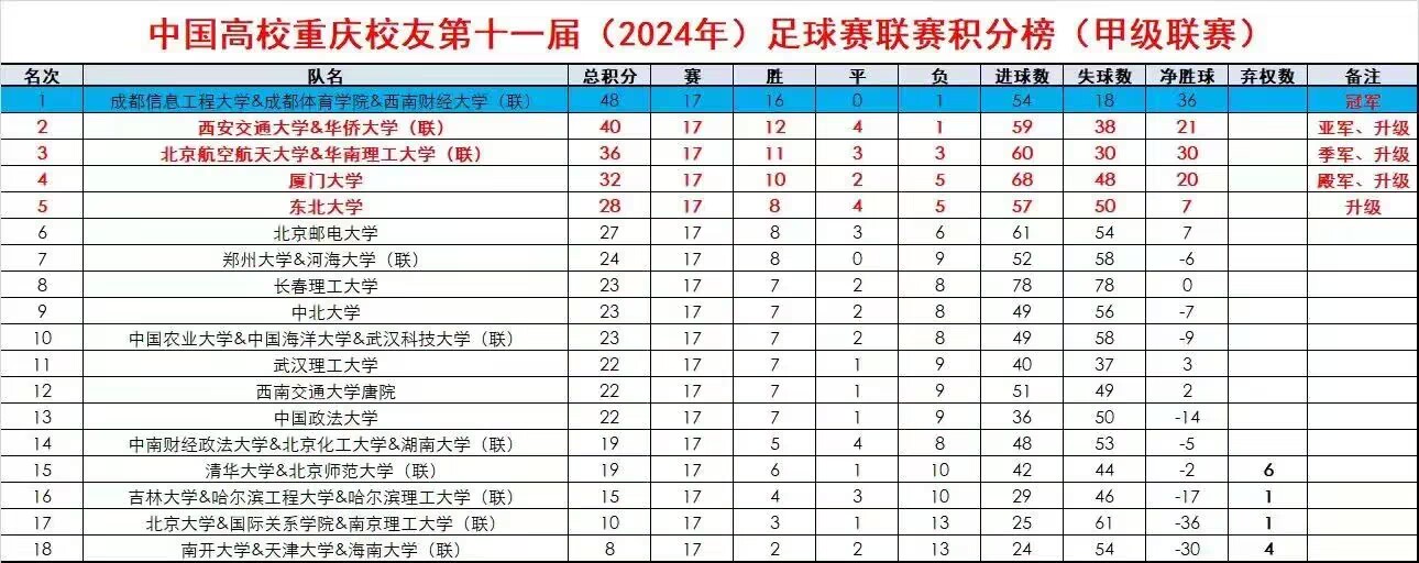 在5:2战胜北京航空航天大学&华南理工大学后,球队提前一轮锁定冠军,12月21日最后一场比赛又以4:1的战绩战胜东北大学队,赛季进球数达到54个,净胜球36个,冠军荣耀,实至名归!